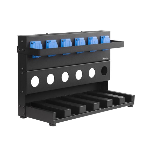 Sørg for at åndedrettsvernet er fulladet, sikkert og klart til bruk med 3M Adflo batteriladestasjon, EU, 833706. Denne ladestasjonen er kompatibel med både eldre NiMH-batterier og nyere litium-ion-batterier, og lader seks EU-batterier samtidig.