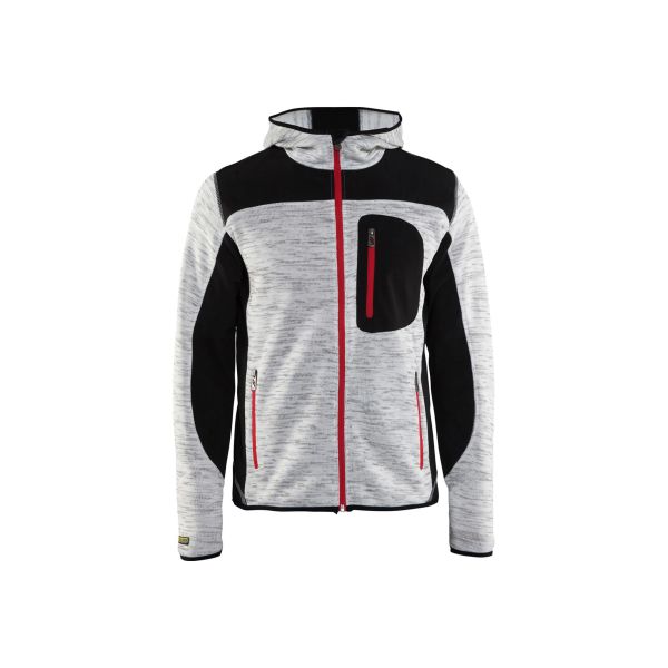 Strikket jakke med hette i stilig design og behagelig kvalitet. Jakken har glidelåser i kontrastfarge og er forsterket med softshellmateriale på skuldre og nederkant bak for økt slitestyrke og holdbarhet. Både til fritid og arbeid – dette er en jakke det er lett å trives i.