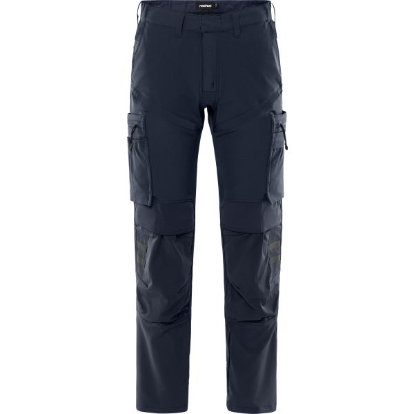 Lett 4-veis stretchmateriale / Slitesterkt ripstop-materiale med 4-veis stretch foran og bak / Skjult knapp i midjen / 2 frontlommer / 2 baklommer med glidelås / Dobbelt forsterket skrittsøm / Benlomme med trykknapp og innvendig hempe som holder en tommestokk på plass, lomme med glidelås, pennelomme og 2 verktøylommer / Benlomme med trykknapp, lomme med glidelås samt telefonlomme, ID-kortlomme og D-ring under klaff / Knelommer i ripstop-stretch med åpning utenfra, ovenfra / Kneputene i knelommene kan høydejusteres / Ripstop-forsterket benavslutning / Refleksdetaljer. Materiale: 92 % polyester, 8 % elastan. Ripstop stretchmateriale 87 % polyamid, 13 % elastan. 205 g/m². Ripstop stretchmateriale 250 g/m². Vaskeanvisning: 60 °C.