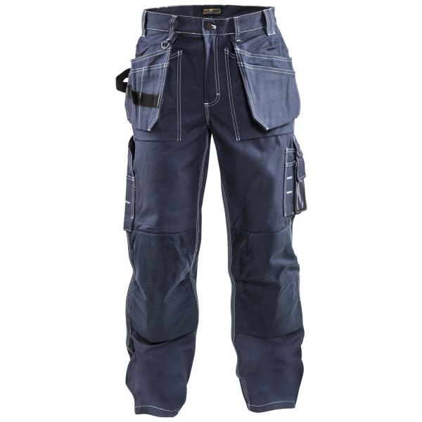 - Detaljer: Gylf med metallglidelås. To løkker i sidene med knapp for hammerholder, en løkke med D-ring foran. Bred løkke bak. Metallknapper. Innerbensøm med 3-nålsstrikking. ID-kortlomme. Lommer: Baklommer med belg. Benlomme med belg, klaff og pennelomme, ekstra lomme, telefonlomme og ID-kortlomme. Framlommer med belg. Knebeskyttelseslommer. Spikerlommer - med meisellommer og verktøyhanker som kan legges i de belgede framlommene. Tommestokklomme med knivholder og pennelomme.