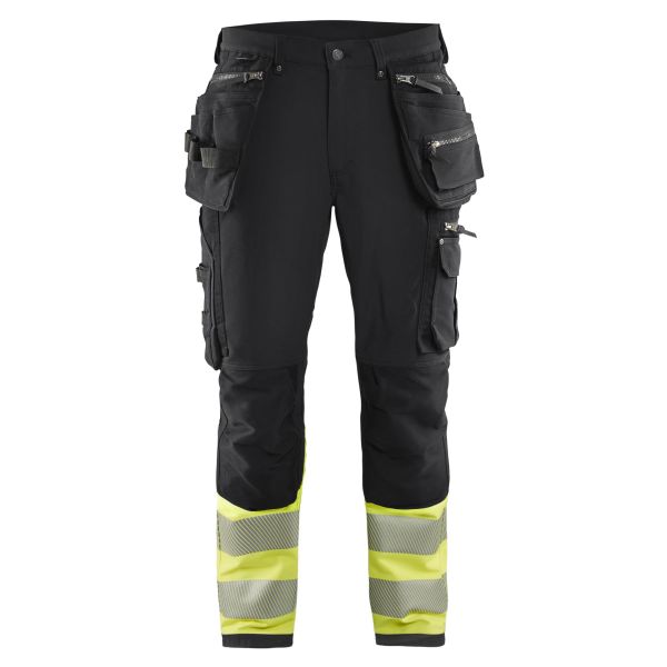 Smidig og komfortabel varselbukse, ekstremt myk og bevegelig med smalere passform. Buksen er konstruert for å tåle krevende arbeidsoppgaver uten å gå på akkord med komfort og passform. Materialet er myk 4-veisstretch som er både sterk og føyelig i alle retninger. Buksen har avanserte detaljer og praktiske lommer med CORDURA®-forsterkning, benlomme med glidelås og belg, tommestokklomme, framlommer, baklommer med klaff og funksjonelle verktøyholdere, f.eks. løkke for hammerholder. Knebeskyttelseslommen er forsterket med CORDURA®-stretch utvendig og stretch innvendig for økt bevegelighet. Myk meshstretch i knehase for god ventilasjon. Benavslutning med CORDURA®-forsterkning gir effektiv beskyttelse mot slitasje. Sertifisert iht. EN ISO 20471 klasse 1 beskyttelsesplagg med høy synlighet. Materiale: 94 % polyester, 6 % elastan, vannavvisende finish, 4-veisstretch, 330 g/m². Vasketips: 40 °C.