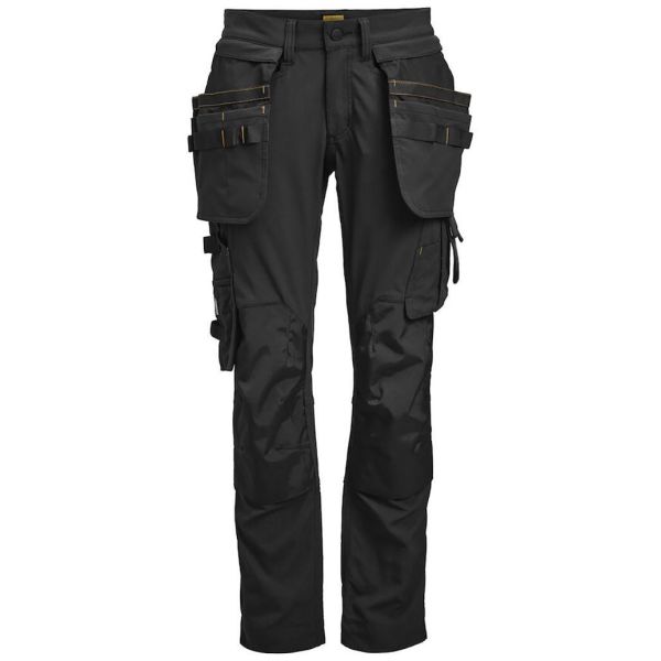 Jobman 2371 Arbeidsbukse. Damearbeidsbukse i 4-veis stretch med seksjoner av slitesterkt vevd stoff ved anklene, lårlommer og hengelommer. Avtakbare hengelommer med glidelåsfunksjon og med ekstra rom og forsterket innside, kan puttes i frontlommene. Lårlomme med tildekket glidelås, ID-kortlomme og telefonlomme. Formsydde knær med knelommer i slitesterk polyamid med to høydenivåer for knebeskyttere på innsiden. Mesh i knefoldene for ventilasjon.