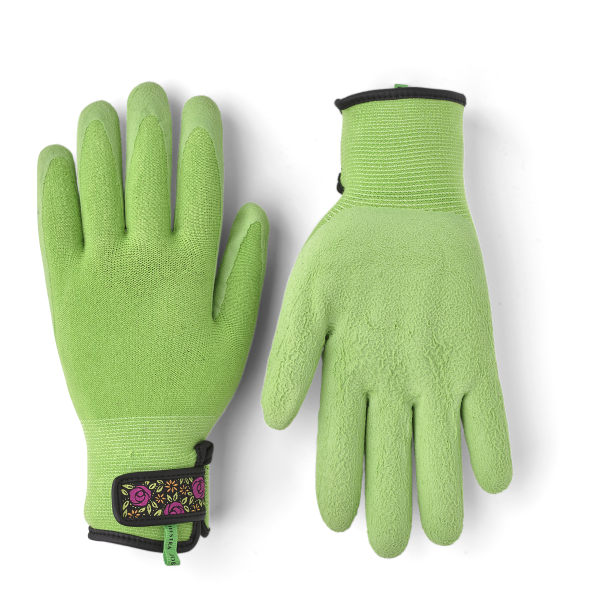 Hestra Job Garden Bamboo er en myk og smidig hagehanske strikket i bambus/spandex. Hansken er sydd helt uten sømmer for en ekstra bra passform. Garden Bamboo gir et godt grep i både tørre og våte miljøer siden den er dyppet i lateks. Utstyrt med dekorativt mønstret borrelåslukking.
