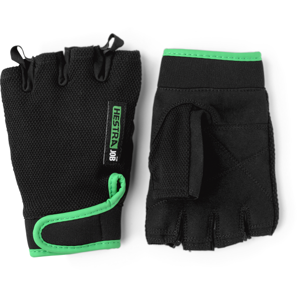 Svarte hansker med halvfingre for pakkehåndtering og annet arbeid som ikke krever beskyttelse av fingrene. Overdel i elastisk Spandex og forsterket innside i syntetisk materiale. Krage med borrelåslukking. Avtrekksløkke mellom fingrene gjør det enklere å ta av seg hanskene.