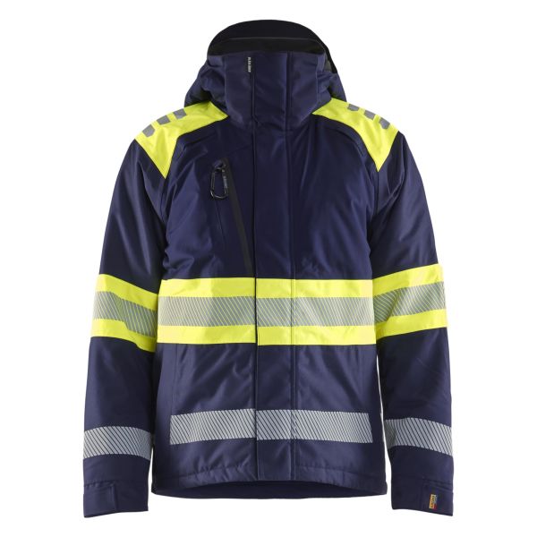 Meget slitesterk vinterjakke i varsel klasse 1. Jakken med quiltfôr er vind- og vanntett med tapede sømmer. Jakken har forsterkninger i front og på ermer, og har en romslig og behagelig passform med ryggpanel i stretch for ekstra komfort og bevegelighet. Hetten er avtakbar og tilpasset hjelmer og hørselsvern. Finnes også som damemodell 4470.