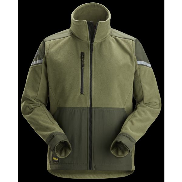 Denne vannavvisende jakken er laget av et vindtett fleecemateriale i 3 lag, som gir god bevegelighet og god beskyttelse. Modellen har CORDURA-forsterkninger på spesielt utsatte områder, som skuldrene, baksiden av ermene og lommene foran. Den har høy krage og formede ermer for komfort og bevegelsesfrihet. Jakken har justerbar nederkant med strikk, samt refleksprint og refleksbånd for økt synlighet. Jakken har i tillegg en brystlomme på høyre side med meshpanel for ventilasjon, en kengurulomme med glidelås nederst og et Snickers Workwear-trykk foran.