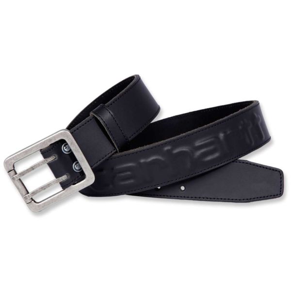 Carhartt A0005656BLK er et lærbelte for menn med en hevet Carhartt-logo.