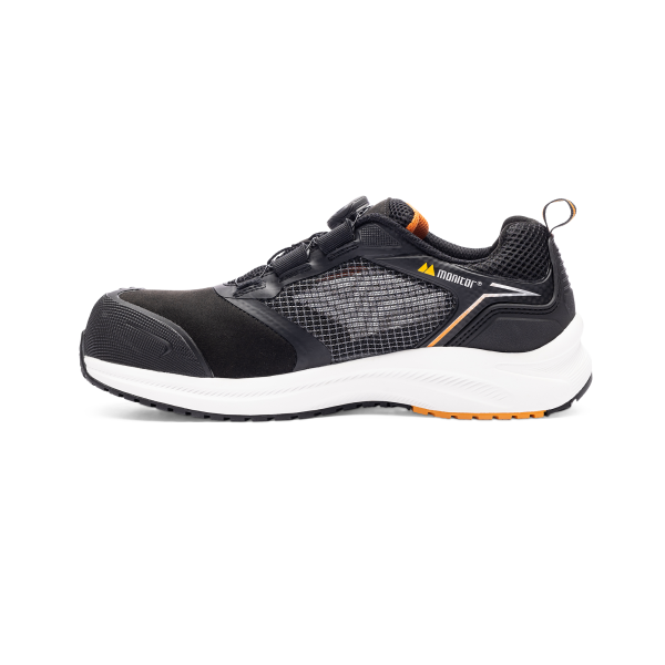 Monitor Recharge Air har en bred passform med komposittåhette og spikertrampbeskyttelse i APT. Air-overdelen er laget i luftig mesh med forsterkning over tå og hæl. Mellomsålen er produsert i EVA, yttersålen i HRO- og FO-gummi, og innersålen er laget i polyuretan med tekstiltrekk. Snøringen er med BOA Fit System L6. Skoen er helt metallfri.