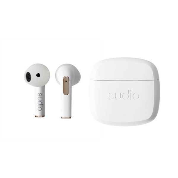 Sudio N2, trådløse hodetelefoner med open-ear passform. Hør på musikk og ta imot samtaler når du er på farten. Ta dem bare ut av ladeetuiet og start dagen. Hodetelefonene har sprutbeskyttelse med IPX4-klassifisering.