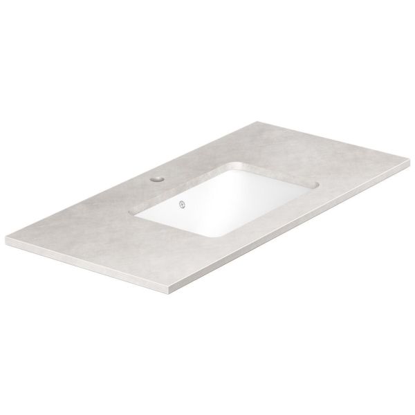 Art.nr: 4076307Grå benkeplate i kompaktstein med underlimt vask i porselen, passer Ducentic-kommoder. Benkeplaten har en bredde på 100 cm og et hull for ett-hulls servantbatteri.