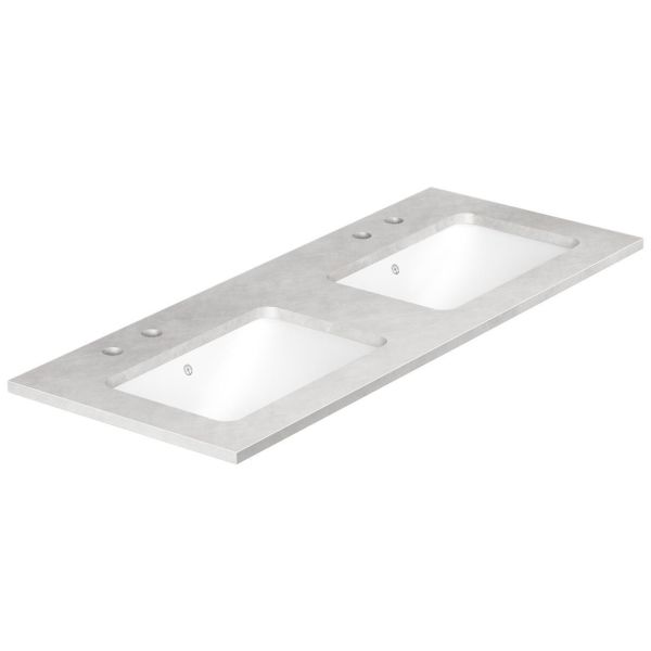 Grå benkeplate av kompaktstein med to undermonterte porselensvasker som passer Ducentic-kommoder. Benkeplatens bredde er 120 cm, og den har fire blandebatterihull (2+2) for tohullsservantbatterier. Ducentic-kolleksjonen er en hyllest til det formspråket som har preget Gustavsbergs uttrykk gjennom tidene. Finnes i ulike farger og ferdige hullutforming for både enkelthullsservantbatterier og tohullsservantbatterier.