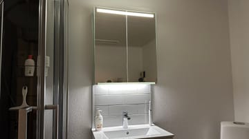 - På undersiden av skapet finnes en LED-belysning som gir et godt lys nedover, for eksempel mot vaskeservanten
