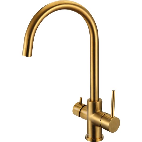 Ettgrepsbatteri med 35 mm keramisk innsats og høy svingbar U-tut. Tuten sperres til 120 grader ved å trekke til skruen på blandebatteriets bakside. Hendelen for oppvaskmaskinavstenging føres til siden for å åpnes, noe som gjør det tydelig om vannet til oppvaskmaskinen er på eller av. Tilkoblingsslanger i myk, metallomspunnet PEX (Ø 10x500 mm) er inkludert. VA- og SINTEF-godkjent.
