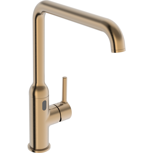 Hybrid kjøkkenkran, børstet bronse, med enkeltgrep/berøringsfri funksjon via THM, pinnespak, høysvingbar J-tut og strålesamler. Svingradiusen til utløpstuten er forhåndsinnstilt til 120° (kan begrenses til 0°/60°/360°). Innebygd lås for å begrense temperatur og strømning via Oras 3.0 keramisk kassett. F = fleksibel tilkobling. Kan suppleres med 839 41 37, Oras 272100-81 Smart fjernstyrt avstengningsventil.