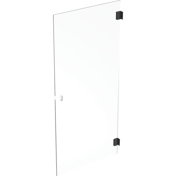 Rett dusjdør uten profiler. Dusjdøren er vendbar, har hullhåndtak og er laget av gjennomsiktig sikkerhetsglass.
