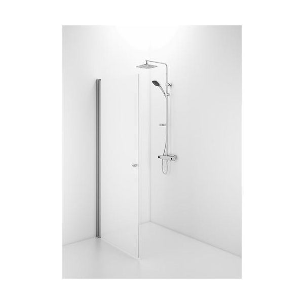 Ifö Space SPNF 900 er en rett dusjvegg med håndtaksknott. Veggen er i frostet, herdet sikkerhetsglass og har matt aluminiumprofil.