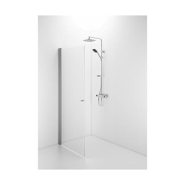 Ifö Space SPNK 900 er en rett dusjvegg med grepknott. Veggen er i herdet sikkerhetsglass og har matt aluminiumprofil.
