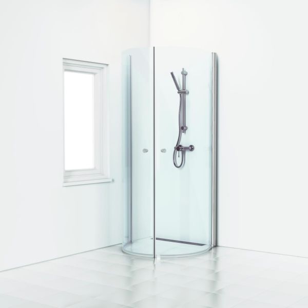 Svedbergs Skoga 6130048 er en buet dusjvegg, som også fungerer som dusjdør. Enkelt dørblad i klart glass med blank profil.