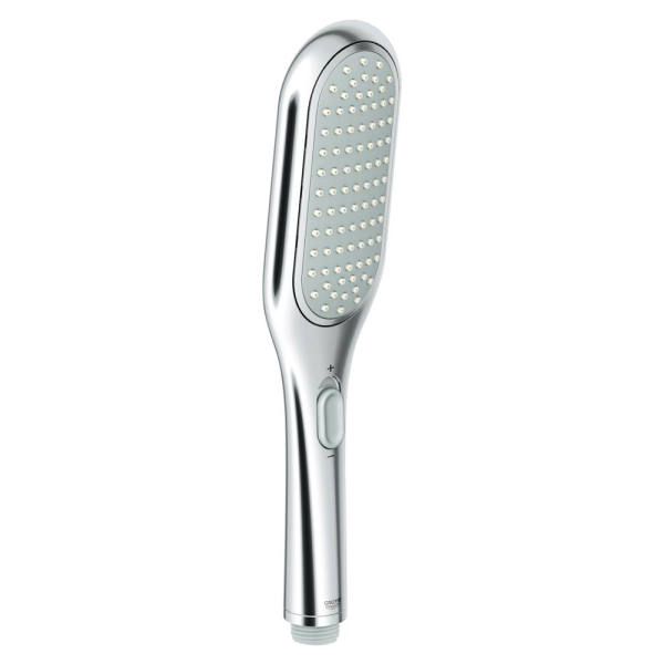 Rainshower Eco 120 hånddusj, 2 strålemønstre: Rain og SmartRain, Eco-funksjon, vinkeltilkobling for hånddusj med dusjsett, GROHE StarLight kromoverflate, GROHE DreamSpray, SpeedClean antikalksystem.