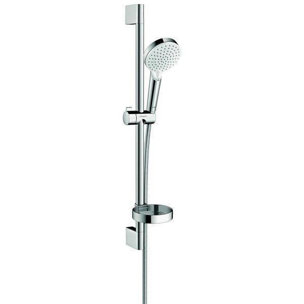 Hansgrohe Crometta Vario dusjsett, med 65 cm dusjstang, hånddusj, skyvebrakett og såpeskål. Hånddusjen har en hodediameter på 100 mm og to forskjellige stråletyper: Rain og IntenseRain.
