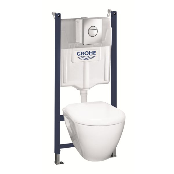 Solido Compact Set 4 i 1 med keramisk sisterne GD 2, 1130 mm installasjonshøyde, for for- eller elementmontasje, stålramme, pulverlakkert, selvbærende, for kledningsvegger, ferdig forhåndsmontert, faste tilkoblinger, rask installasjon, festemateriale, TÜV-testet, 2 WC-bolter, keramisk montering, skrueavstand 180/230 mm, avløpsbøyning Ø 90 mm, justerbar dybde, reduksjon Ø 90/110 mm, til- og avløpsarmatur, sisterne 6–9 l, fabrikkinnstilt 6 l og 3 l, pneumatisk avløpsventil med 3 funksjoner: dobbelspyling, start & stopp eller enkelspyling, forberedt for vanntilkobling fra venstre, høyre eller ovenfra, armaturgruppe l, under 20 dB lydnivå, kondensisolert, vinkelventil DN 15, vanntilkobling med PEX-tilkobling, verktøyfri montering av inspeksjonsluke og byggtidssikring, for vertikal eller horisontal bruk, med veggbraketter, installasjon på plass, med betjeningsplate Nova Cosmopolitan, loddrett og vannrett montering, 156 × 197 mm, i ABS, krom, vegghengt WC, hvit, WC-sete med softclose.