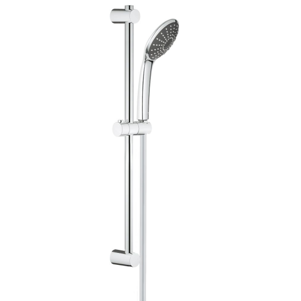 Ta dusjen til neste nivå med dusjsettet GROHE Vitalio Joy 110 Mono. Settet er utviklet som en enkel oppgradering som forbedrer både utseende og ytelse i alle moderne baderom. Juster til perfekt dusjhøyde med GROHE Vitalio Universal dusjstang på 620 mm. Dusjen får en luksuriøs følelse med hånddusjen på 110 mm i diameter og den myke, beroligende stråletypen Rain Spray, samtidig som EcoJoy-funksjonen begrenser vannmengden til 9,5 l/min, noe som sparer både vann og energi. GROHE DreamSpray sikrer jevn vannfordeling fra hvert enkelt munnstykke, og Inner WaterGuide sørger for at overflaten på dusjen holdes kjølig å ta på. Settet er enkelt å rengjøre takket være SpeedClean-silikonmunnstykker som kan gnis fri for kalk med bare en finger, og den blanke forkrommede GROHE Starlight-overflaten gir en ripebestandig finish som beholder glansen i mange år. GROHE QuickFix-systemet er ideelt for en enkel oppgradering og gjør at du kan montere det justerbare øvre veggfestet i eksisterende borehull. Settet inneholder også en GROHE VitalioFlex Silver dusjslange (1 750 mm) med Twist-Free-funksjon.