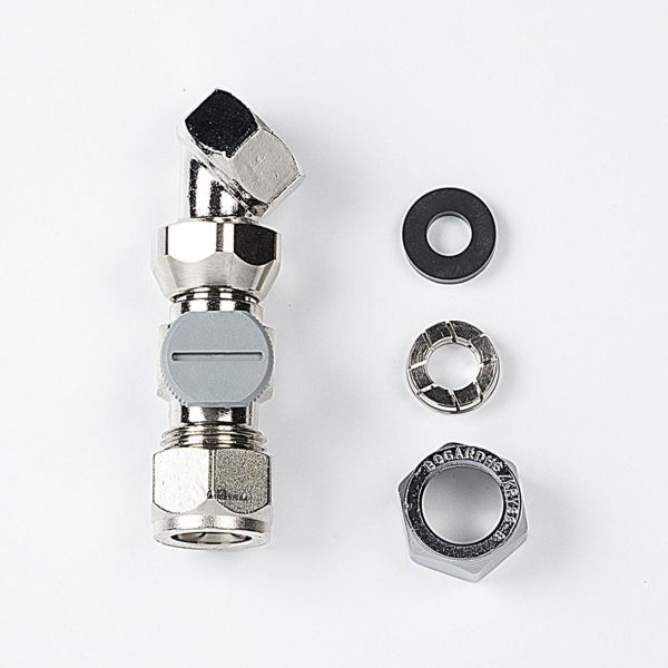 IDO avstengningsventil. Sett som inneholder metallventil 45° med krysskobling, 10 mm kobling.