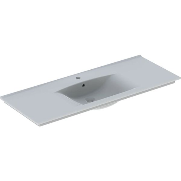 Ifö Elegant er en møbelservant med avstillingsoverflate på begge sider. I utførelsen hvit/Ifö Clean, med målene B=121 cm, D=47 cm. Kranhullet er plassert i midten. Synlig overfylling.