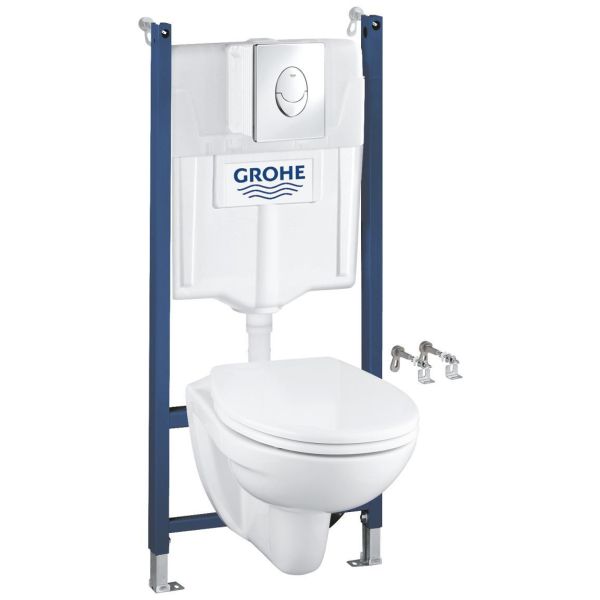 Grohe Solido SL Set 4in1 er en komplett WC-pakke med WC-armatur med 113 cm monteringshøyde, dobbel spyleknapp i krom og vegghengt toalettsete. WC-armaturen har 6-9 liters spyling.