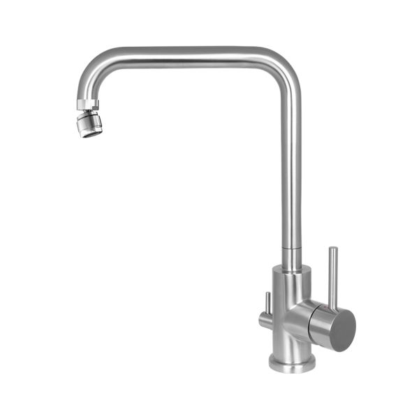 Art.nr: 4076555Kjøkkenbatteri i solid rustfritt stål SS304. Blandebatteriet er utstyrt med patentert sparedyse/strålesamler som øker vannhastigheten og dermed effektiviteten.