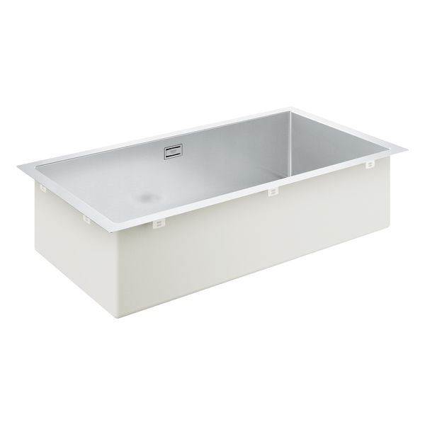 En kumdybde på 20 cm gjør vasken svært praktisk og romslig nok for store gryter og kjeler. Kummen har skarpe vinkler og en elegant diamantformet bunn, komplettert med et minimalistisk, kvadratisk overløp og GROHE Whisper-lydisolering på undersiden som reduserer støy. Vasken er laget av GROHE StarLight AISI 304 rustfritt stål med børstet overflate som gjør materialet mindre porøst og enklere å holde rent, noe som gir et varig, pent utseende.