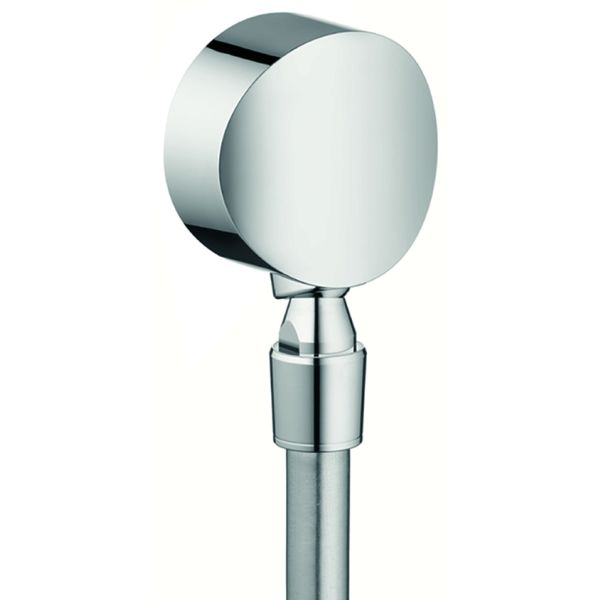 Hansgrohe Fixfit S er en forkrommet slangtilkobling med tilbakeslagsventil. For veggmontering