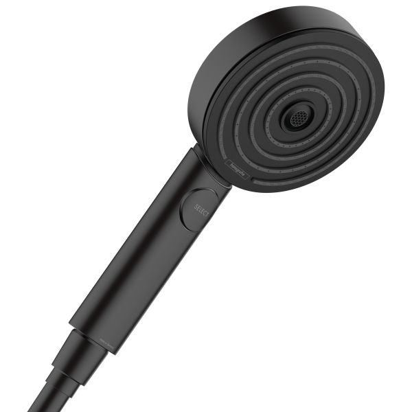 Art.nr: 3114554En matt sort hånddusj med tre stråletyper og en dusjhodestørrelse på 105 mm.