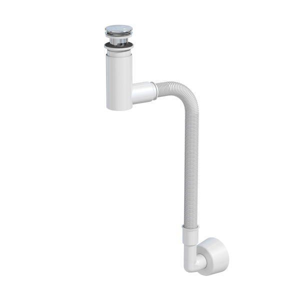 Vannlås i hvit plast med bunnventil/pop‑up i forkrommet messing som rengjøres fra bunnventilen. Utløp 40/32 mm og slangetilkobling for vegg/gulv. Brukervennlig og sikkert mot vannskader. Utløpsrøret er 32 x 892 mm.