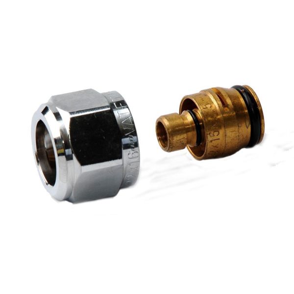 Koblingssett forkrommet for tilkobling til radiatorer, bestående av klemhylse og mutter M22x1,5 for PEX-, Alu-PEX-, PEM- og PB-rør.