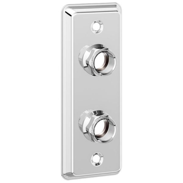 Rustfri dobbel veggbrikke med innvendig gjenge G15. Inkludert avtakbare koblinger for Ø12/15 Cu og VVS-skrue. Tilpasset til de nye bransjereglene 2021 med plass til vanntetting og 60 cc installasjoner. Brikkens dimensjoner: 160 × 60 mm. Skruehull 120 cc.