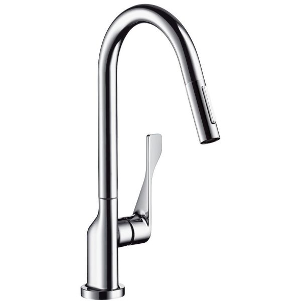 Art.nr: 3087556Axor Citterio kjøkkenarmatur med uttrekkbar hånddusj, sidespak og vannmengde på 9,5 l/min.