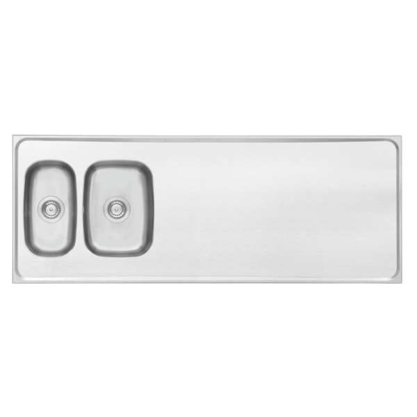 Helflate, vendbar oppvaskbenk med to Contura-kummer som passer i 60-skap, produsert i førsteklasses glatt rustfritt stål med 12 mm tykke lydisolasjonsplater under benkeplanet og fall i planet mot kummene. Oppvaskbenken leveres komplett med vannlås og forsterkning for kranhull. Kumdybde 160 mm.