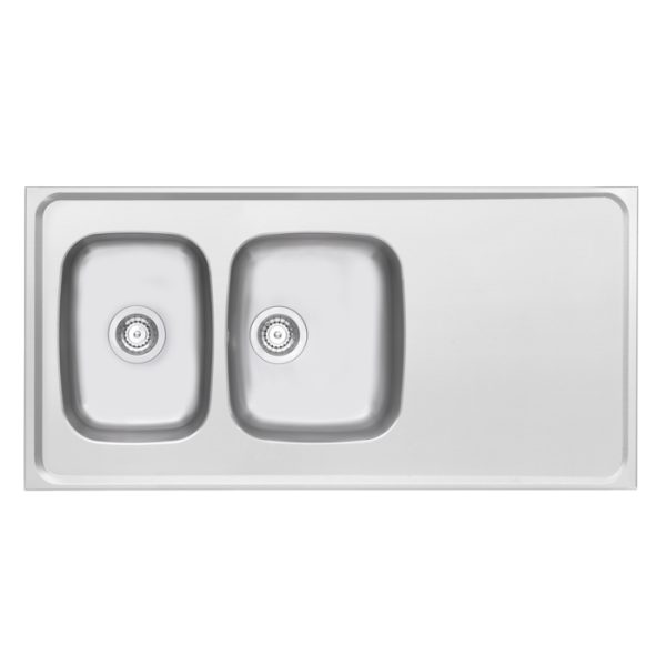 Art.nr: 3086578Vendbar oppvaskbenk, 1220 x 600 x 30 mm, leveres med vannlås og 2 avstengbare kurvventiler. To store oppvaskkummer.