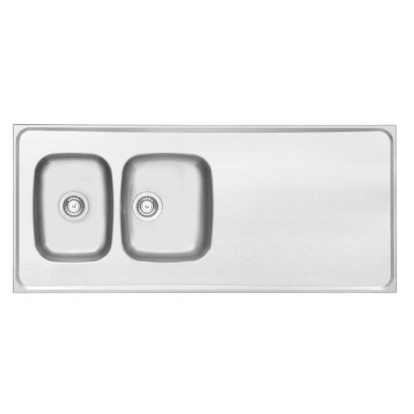 Heldekkende vendbar kjøkkenbenk/vaskebenk med to Contura-kummer som passer i 80-skap, produsert i førsteklasses glatt rustfritt stål med 12 mm tykke lydisolasjonsplater under benkeplanet og fall i planet mot kummene. Vaskebenken leveres komplett med vannlås og forsterkning for kranhull. Kumdybde 160 mm.