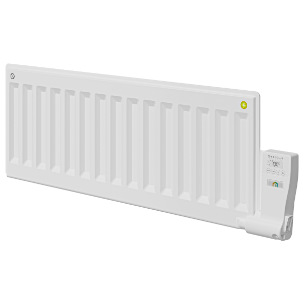 Art.nr: 4013353KABA, oljefylt elradiator fra LVI by PURMO. Elektronisk PID-termostat med digitalt display, ukeprogram, åpent-vindu-deteksjon og tastelåsfunksjon, montert på høyre side.