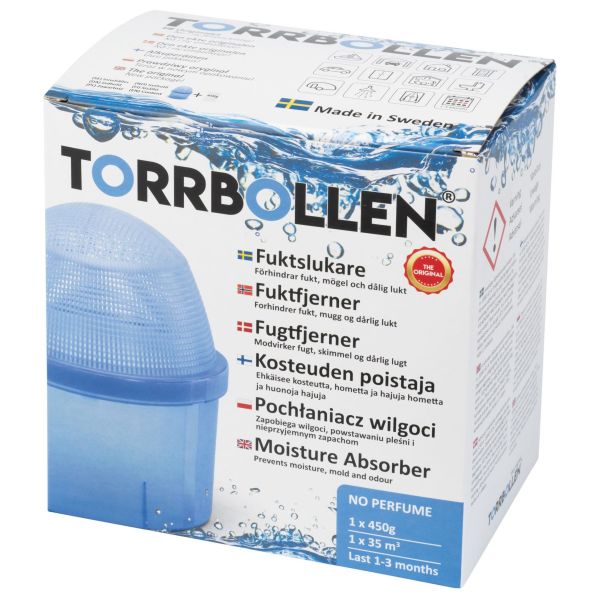 Torrbollen 7100 er en fuktsluker som absorberer overskuddsfukt fra luften rundt, noe som reduserer risikoen for mugg, sopp og vond lukt. Fuktslukeren leveres med en refillpose som varer i 1–3 måneder, avhengig av hvor fuktig luften er der den plasseres. Egner seg for rom og flater på ca. 12–14 m².