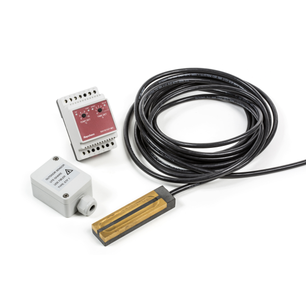 Temperaturføler RayStat-M2-A-Sensor, til styreenhet RayStat-M2, for temperaturmåling og registrering av utetemperatur/lufttemperatur. Føleren plasseres på takets nordside (skyggeside), så nær takrennen som mulig. Brukes i kombinasjon med takrenneføler RayStat-M2-R-Sensor.