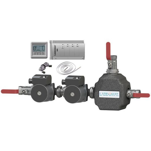 Ladepakke for kjel med innebygd varmtvannsbereder og shunt.Erstatter Laddomat 4030 og eldre versjoner av Laddomat MR 40 (ny termisk treveisventil).For regulering av lading mellom kombikjel og «tom» tank.Har 28 mm tilkobling og en maksimal effekt på 45 kW.