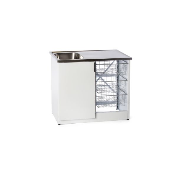 Nimo TB 1000 HT er en hvit vaskebenk. Leveres halvåpen med dør. Tre store trådkurver, vaskemiddelrom, barnesikring, doble oppbevaringsrom i døren, med dørspjeld, skjulte hengsler og en helintegrert sokkel.