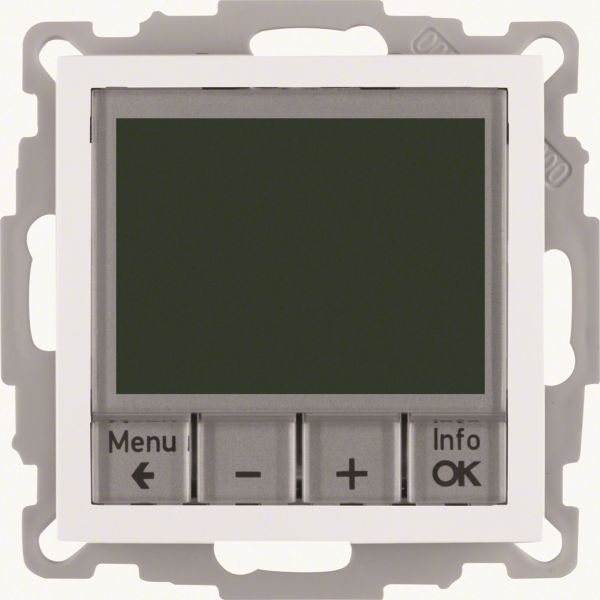 Temperaturregulator med sluttekontakt, med sentrumsplate, kompletteres med ram, tidsstyrt, tilpasning av varmebehovet til individuelle levevaner gjennom styring av romtemperaturen avhengig av tid og ukedag (program). For oppvarming eller kjøling. For rom- og gulvvarme, med integrert temperatursensor, kan kompletteres med gulvvarmesensor, styring ved hjelp av rom- og/eller ekstern temperaturregulator mulig, med ekstra tilkobling for ekstern gulvtemperatursensor, stor bakgrunnsbelyst display med tekstvisning, brukerspråk justerbart: tysk, engelsk, nederlandsk eller fransk, maks. 9 koblingstider per ukedag, 3 forhåndsinnstilte tidsprogrammer som kan stilles inn individuelt, kan programmeres med betjeningspanelet demontert, med manuell/automatisk modusveksling, med automatisk sommer-/vintertidsomkobling (kan deaktiveres), justerbart temperaturreguleringsområde, med manuell justering av temperaturverdi, timer for temperaturveksling per time, ferieprogram med datoaktivering, driftstidsmåler eller visning av energiforbruk justerbar, med ventilbeskyttelsesfunksjon, med frostbeskyttelsesfunksjon, med tilgangsbeskyttelse, PWM- eller 2-punkts (på/av) reguleringsprosess valgfri, PWM-syklus og hysterese (ved 2-punktsregulering) justerbar, type stillingsautomatikk/aktuator (normalt lukket/åpen) justerbar, med selvinnlærende varmekurve, uten spredningsklør, med skruklemmer, nulleder kreves.